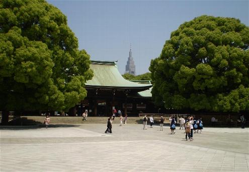 Am Meiji-Schrein in Tokyo: Hier werden die Seelen des Meiji-Tenno und seiner Gattin Shoken-Kotaigo verehrt, bestattet sind die beiden jedoch in der Umgebung Kyotos. Der den Schrein umgebende Park ist riesig und eine der grünen Lungen Tokyos. Im Hintergrund ragt der Hauptsitz von NTT DoCoMo hervor, dem größten Mobilfunkanbieter Japans.