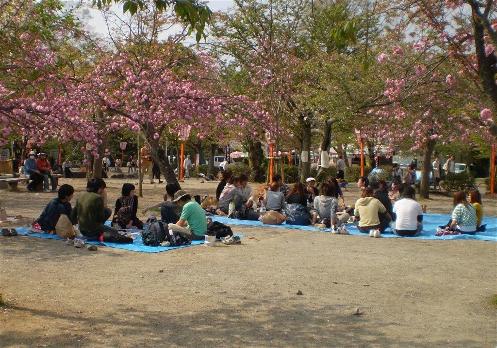 ... und Japaner beim "Kirschblütenfest", japanisch "Hanami" (Blüten angucken). Entgegen romantisierenden westlichen Vorstellungen sitzt man dabei jedoch bis spät abends auf blauen Plastikplanen unter blühenden Kirschbäumen, isst Kleinigkeiten und trinkt Bier und Sake bis zum Umfallen ...